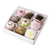 These life-sized treats make the perfect addition to a play tea party. Each petit four is uniquely and intricately designed from polyester fabrics to look almost better than the real thing. The Petit Fours come in a cute box set of nine, complete with individual wrappers.