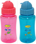 These bottles are PVC-Free and are made with Bisphenol A-Free plastic. They have an underwater theme and a straw spout with sliding lid. The contour shape makes them easier to hold. Includes an additional, washable straw top. Dishwasher safe.