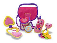 Everything necessary for the little girl on the go! This soft play set includes a cell phone that chimes, a key ring with keys, a change purse with coins, and a compact with a child-safe mirror. Everything is easily removed and replaced into a charming purse with a purple handle. Constructed of high quality fabrics and phthalate-free plastic, this durable set will provide hours of pretend fun!